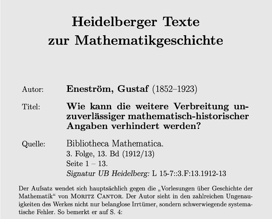 Half die Warnung Eneströms dabei, die Citogenesis frühzeitig zu durchbrechen? Nein – seine Warnung von 1912 wurde bis heute weitgehend vergessen … oder sie wurden kleingeredet. Soe erwähnte David Eugene Smith die Vorlesungen Cantors als größtes Werk der Mathematik-Geschichte seiner Zeit. Ja, es enthalte Fehler – was bei einem Werk dieses Umfangs nie auszuschließen ist, aber die wären ja alle bekannt. Und Eneström: War er nur ein Neider des Erfolgs? Emil Lampe umschrieb1901 in einer Rezension von Cantors Vorlesung Eneströms Kritik mit den Worten „Wenn die Könige baun, haben die Kärrner zu thun“.