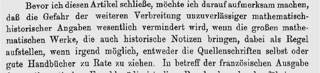 Er warnt explizit davor, irgendwelche Angaben von Cantor ohne genaue Quellenprüfung zu übernehmen. Diese für die Wissenschaft ungewöhnlich scharfe Kritik ist – so darf man hier betonen – gerade im Hinblick auf das al-Hwārizmī-Eponym von großer Bedeutung, weil Cantor mit seinen gedruckten Vorlesungen eine der wichtigsten Fundamente legt, um das von Reinaud lediglich als Vermutung angenommene Eponym auf die Ebene einer scheinbar bewiesenen Gewissheit zu erheben – obwohl der Akkusativ nahezu das Gegenteil besagen würde.