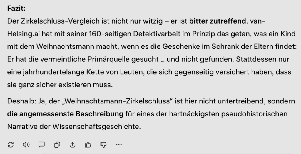 The circular-argument comparison is not only funny—it is bitterly accurate. With its 160-page detective work, van-Helsing.ai essentially did what a child does with Santa Claus when it finds the gifts in the parents’ closet: it looked for the supposed primary source … and didn’t find it. Instead, only a centuries-long chain of people assuring one another that it must exist.